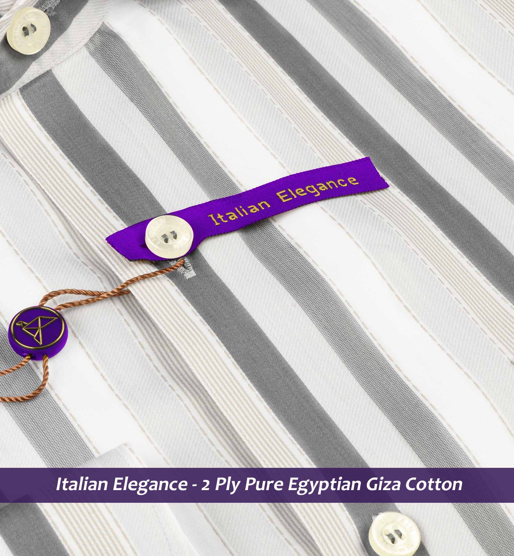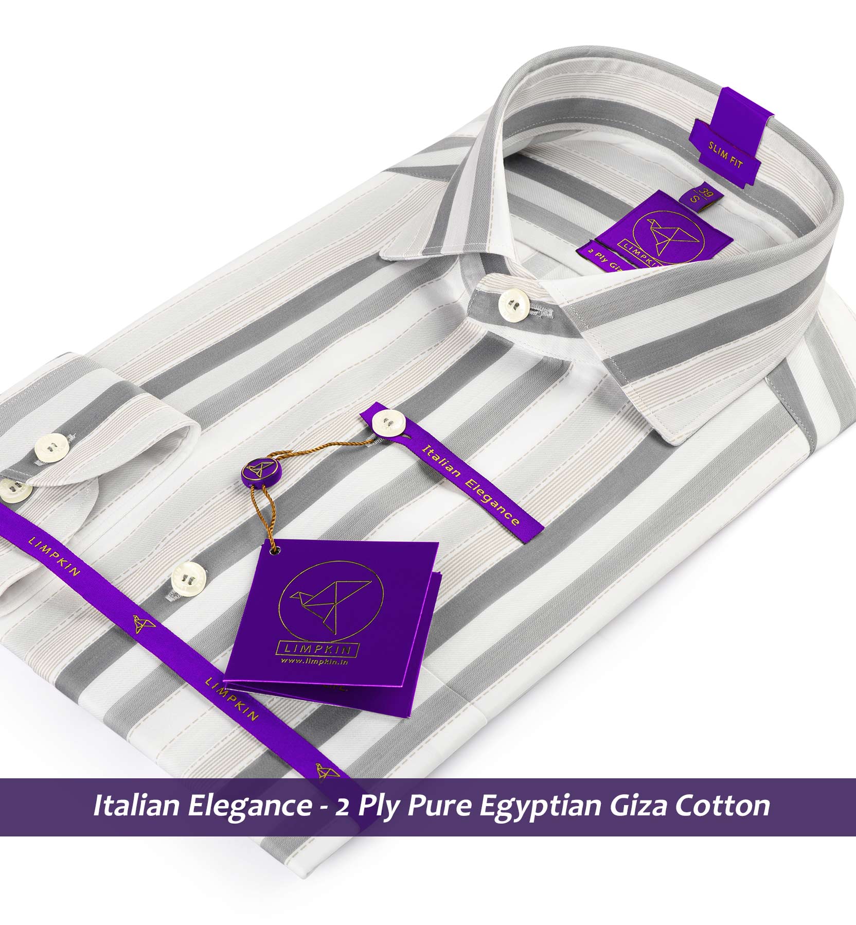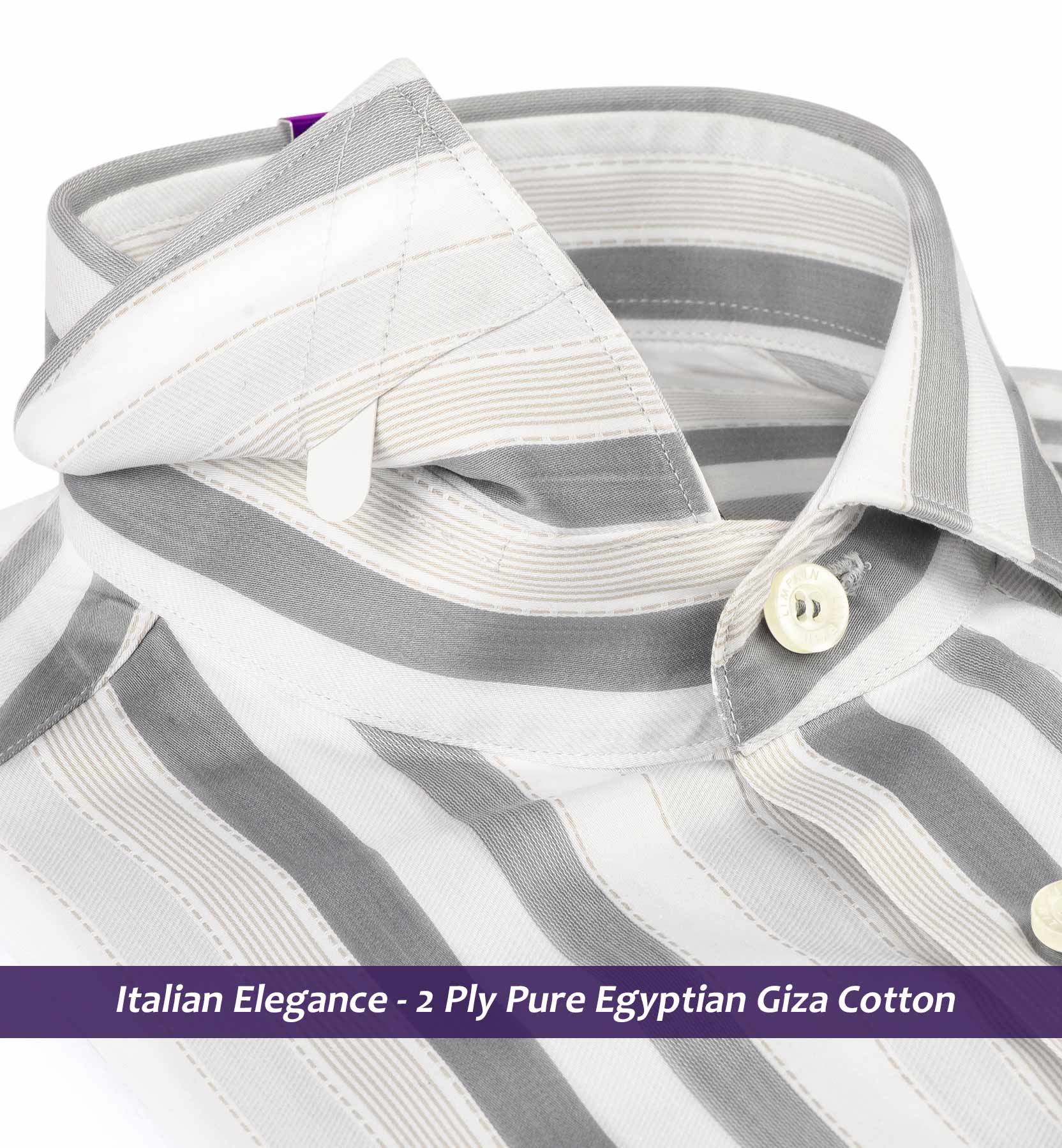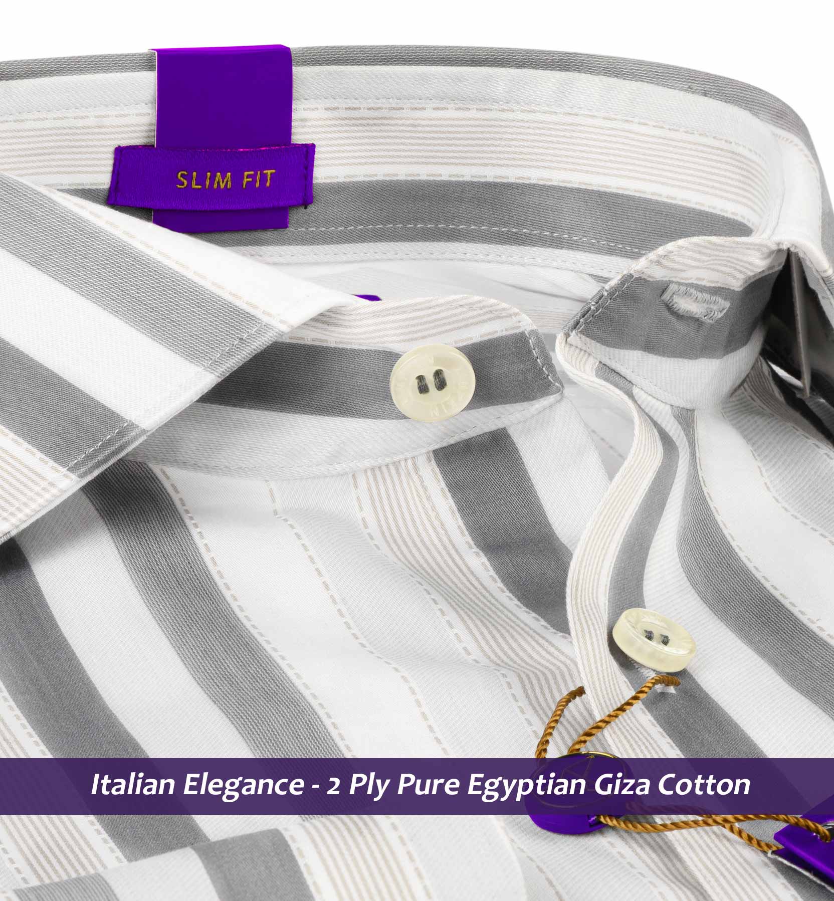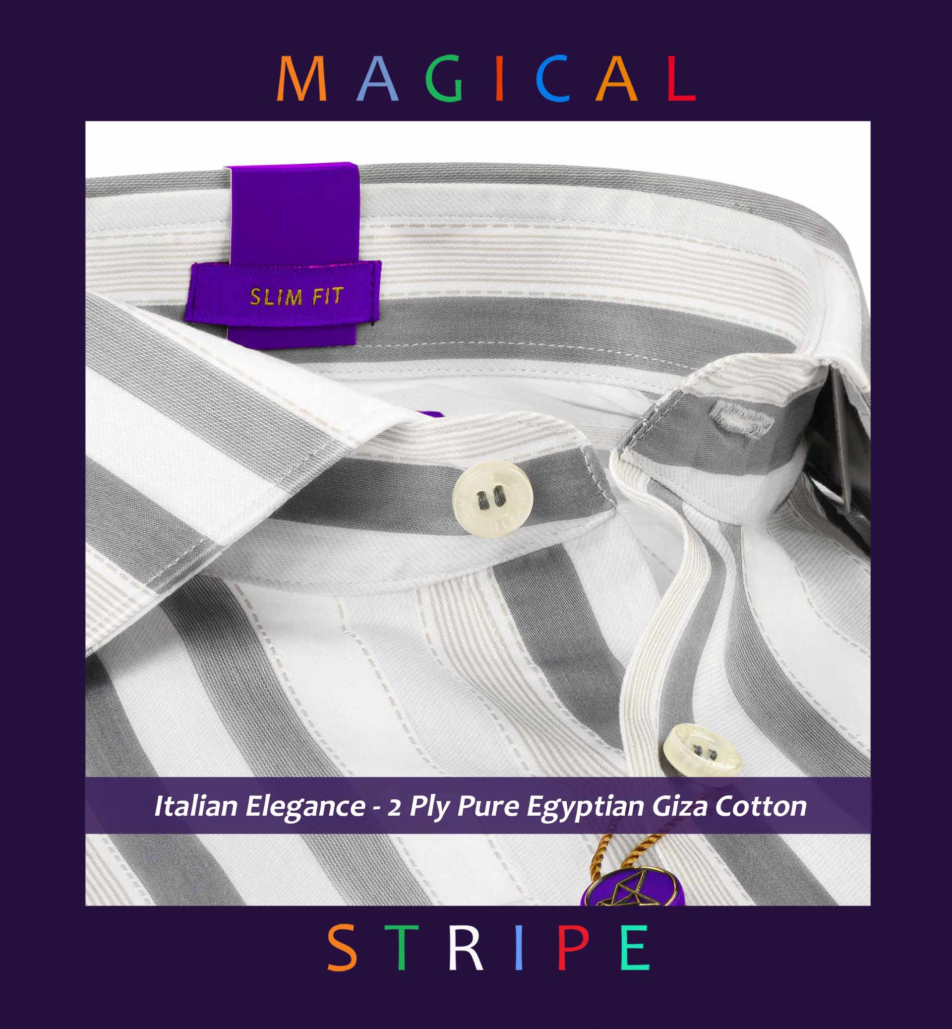 Slim/Regular fit shirt in Anchor Grey & Beige Stripe, Crafted from long staple 2 Ply Pure Egyptian Giza Cotton, Italian Elegance. Finished using superior Soft Touch technology, Soft luster and sheen as well as superior hand feel and drape.