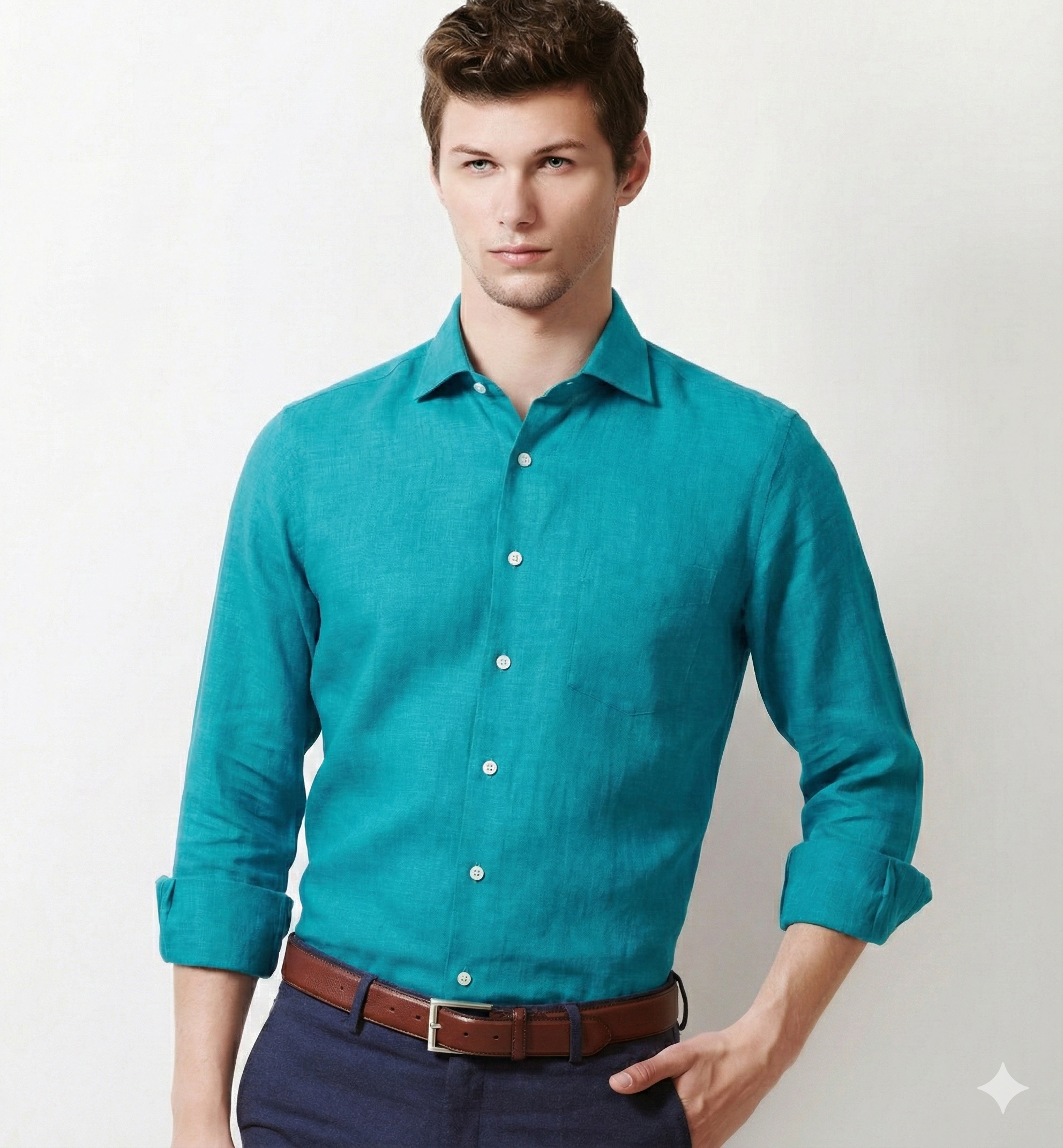 Slim/Regular fit shirt in Turquoise Solid Linen, Crafted from long staple 77's Lea Linen yarn, Italian Elegance, Plain Weave, Subtle sheen as well as superior hand feel and drape.