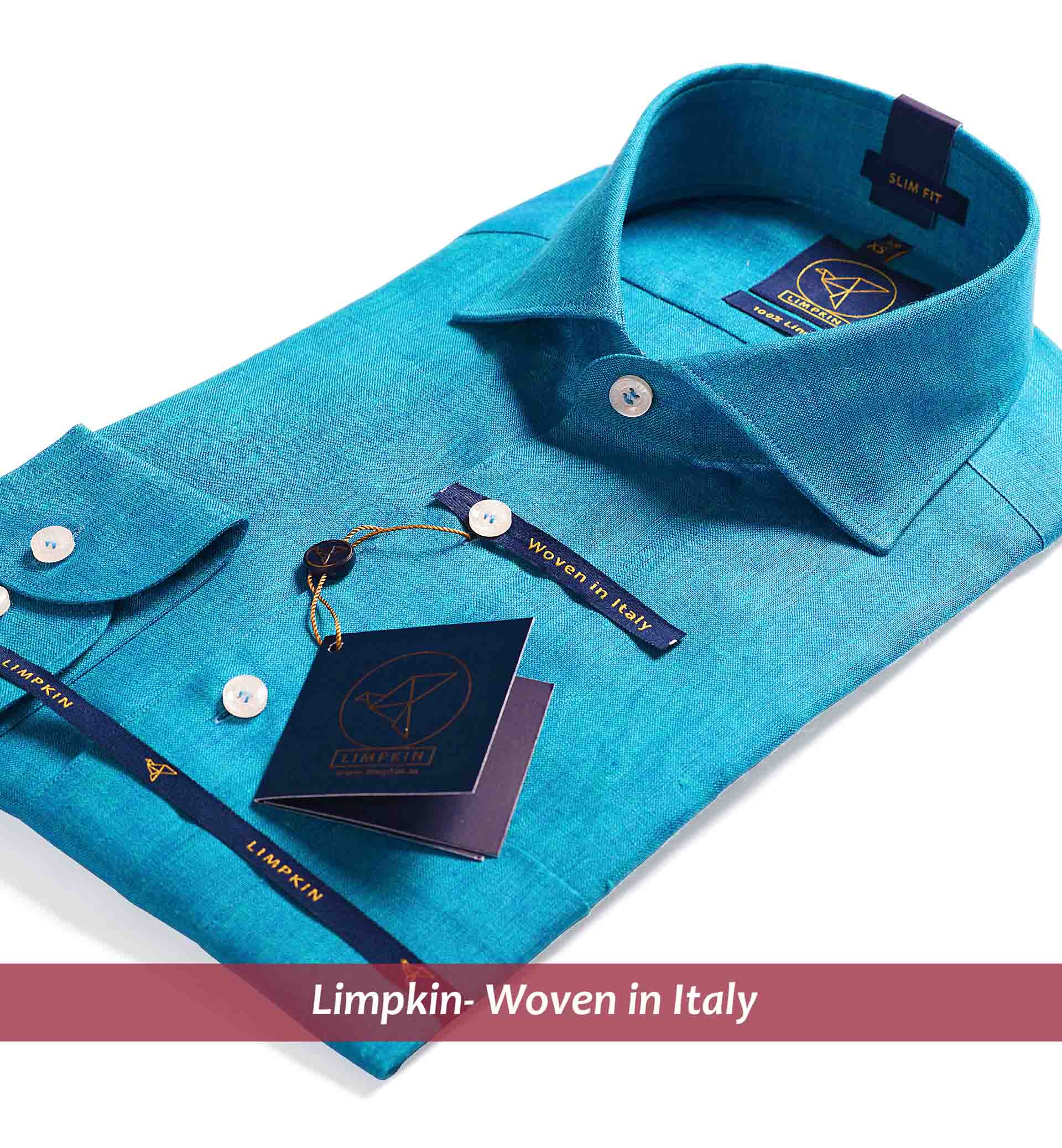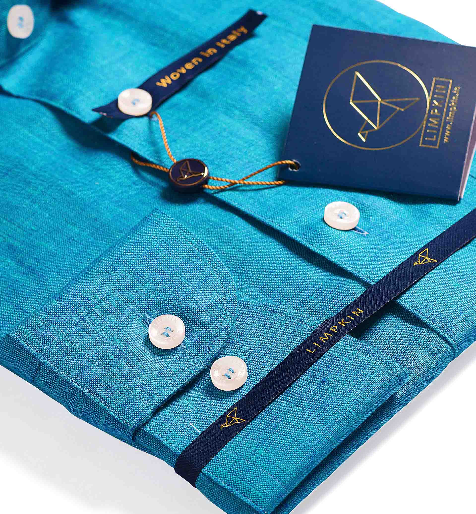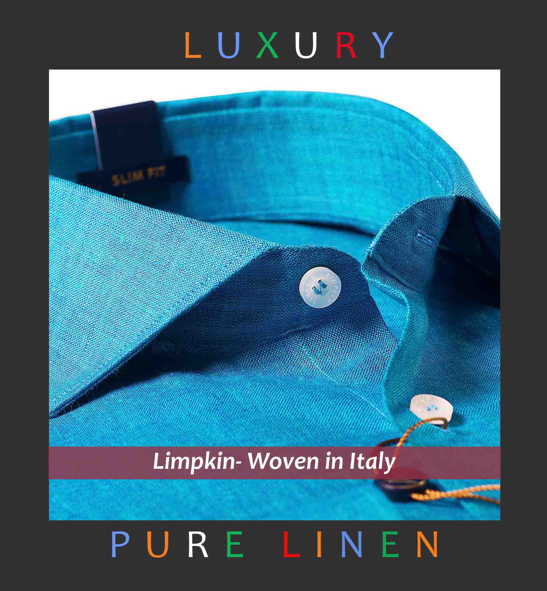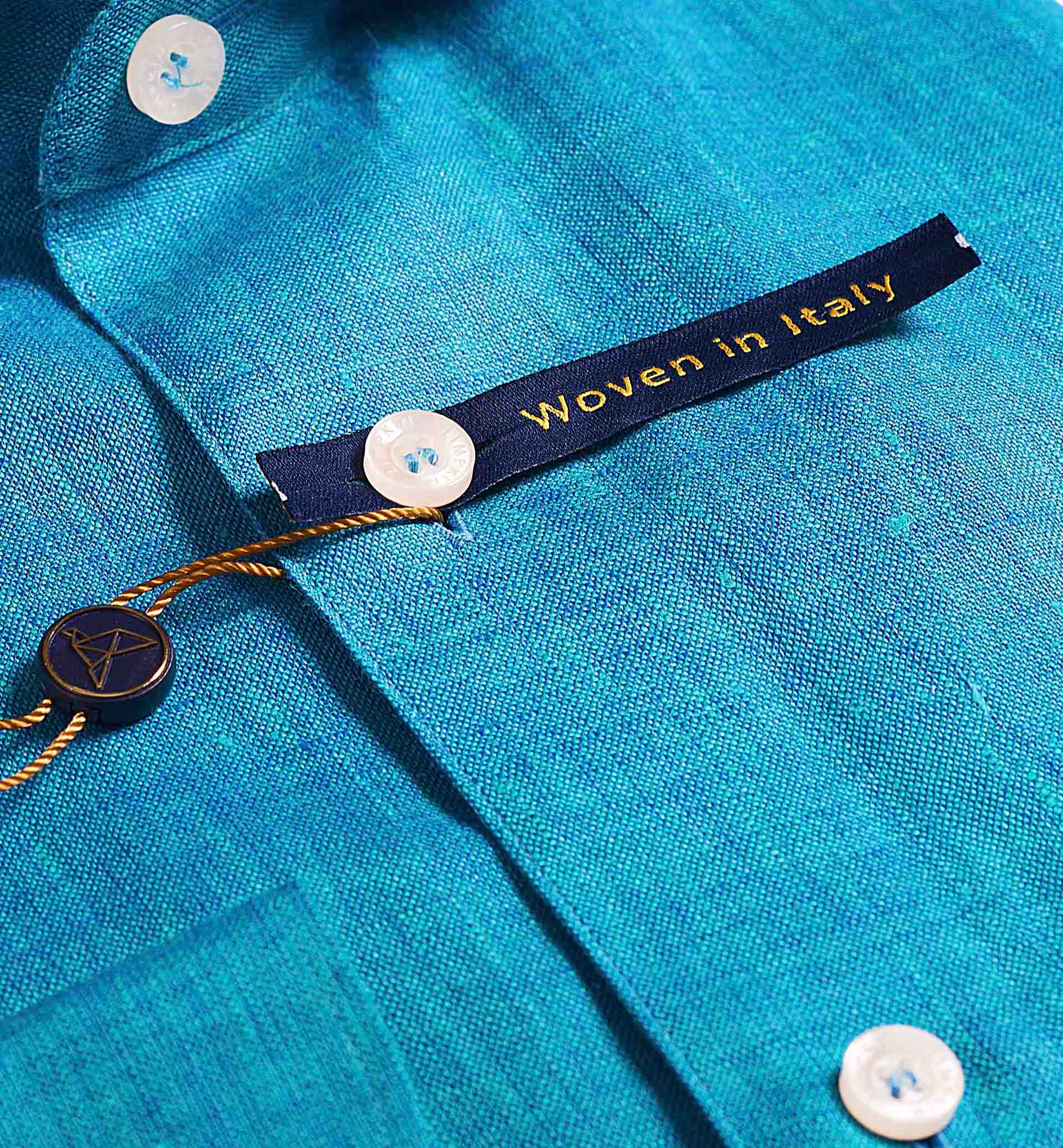 Slim/Regular fit shirt in Turquoise Blue Solid Linen, Crafted from long staple 66's Lea Linen yarn, Italian Elegance, Plain Weave, Subtle sheen as well as superior hand feel and drape.