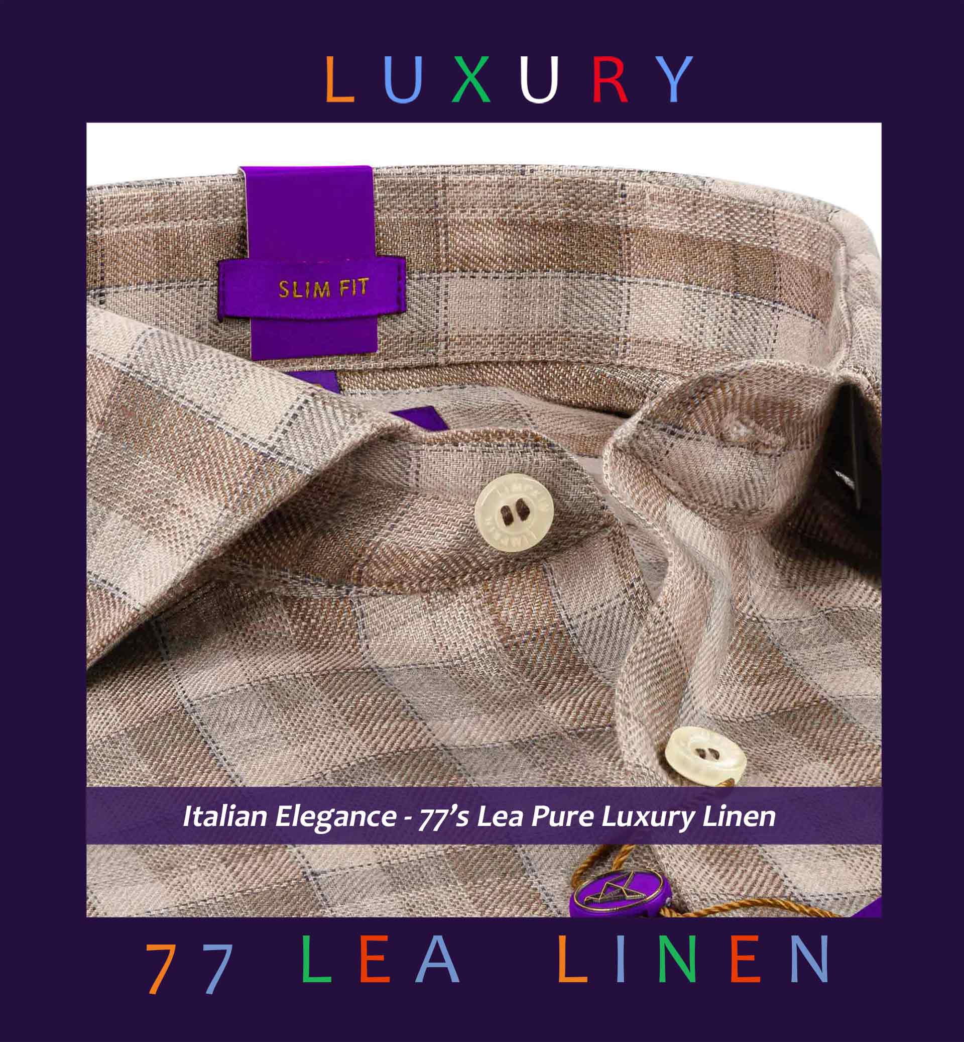 Slim/Regular fit shirt in Beige & Brown Check Linen, Crafted from long staple 77's Lea Linen yarn, Italian Elegance, Subtle sheen as well as superior hand feel and drape.