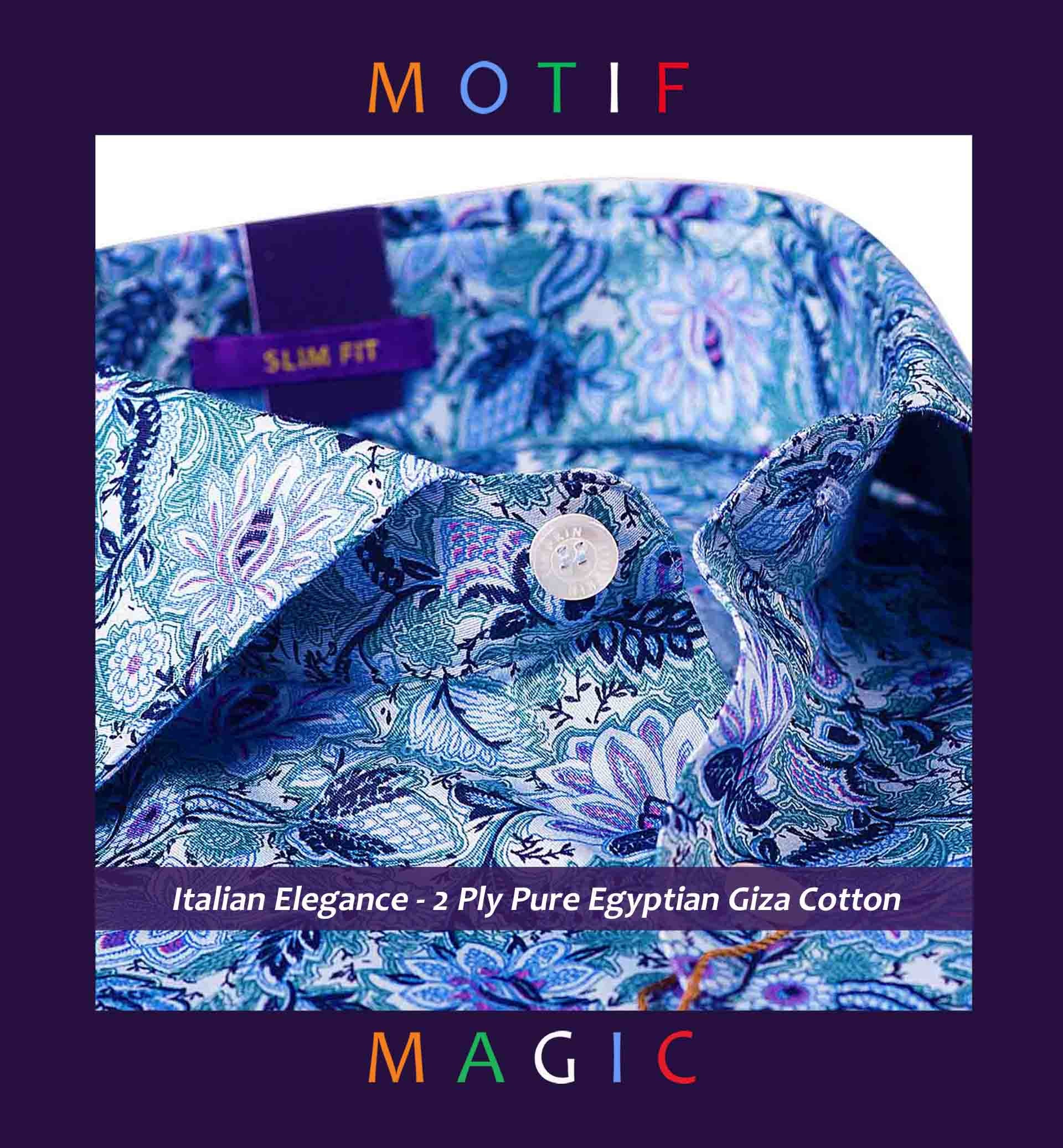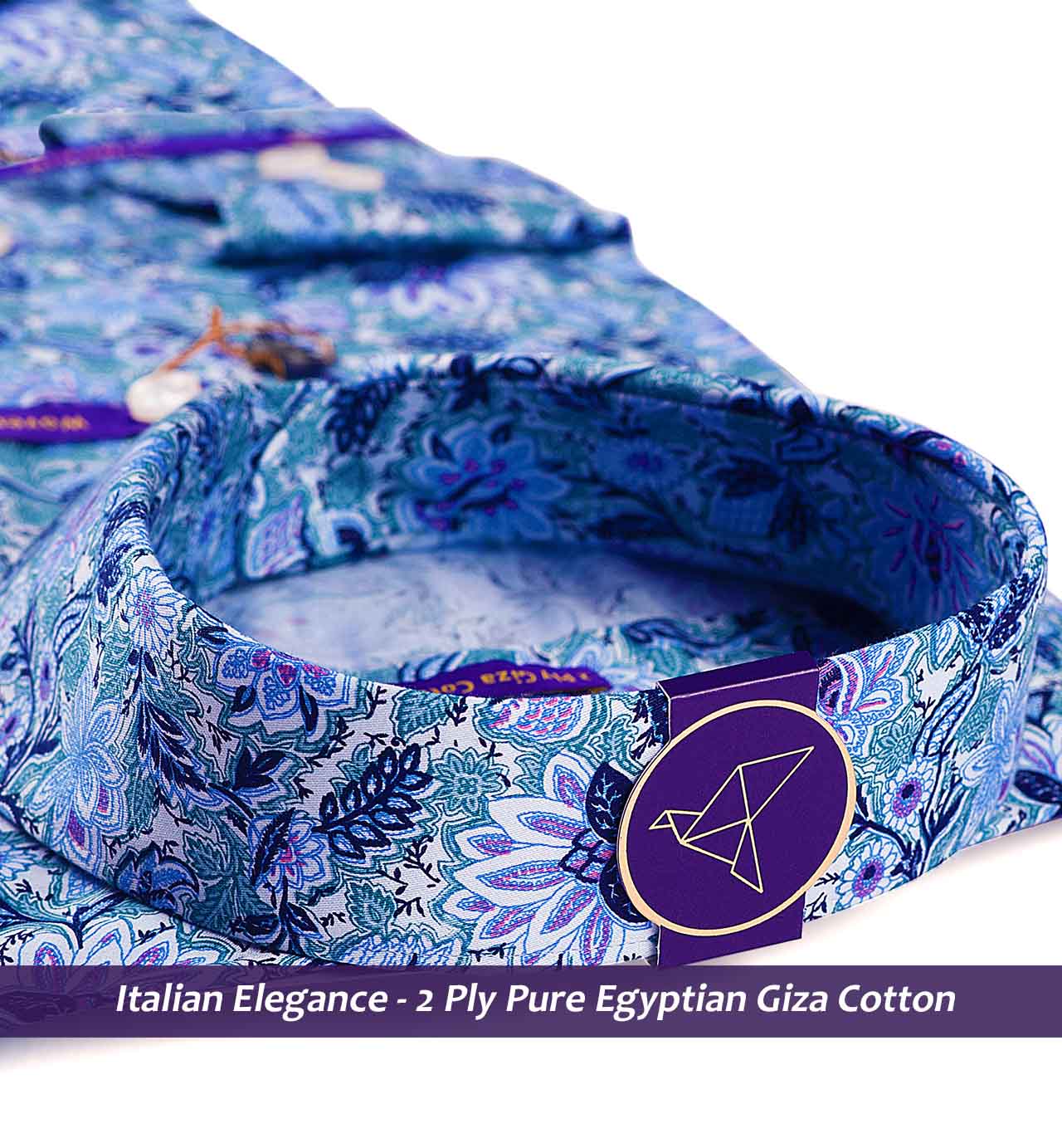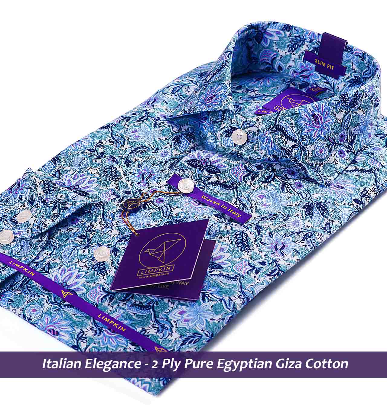 Slim/Regular fit shirt in Navy & Lilac Floral Print, Crafted from long staple Pure Egyptian Giza Cotton, Italian Elegance, Finished using superior Soft Touch technology, Rich luster and sheen as well as superior hand feel and drape.