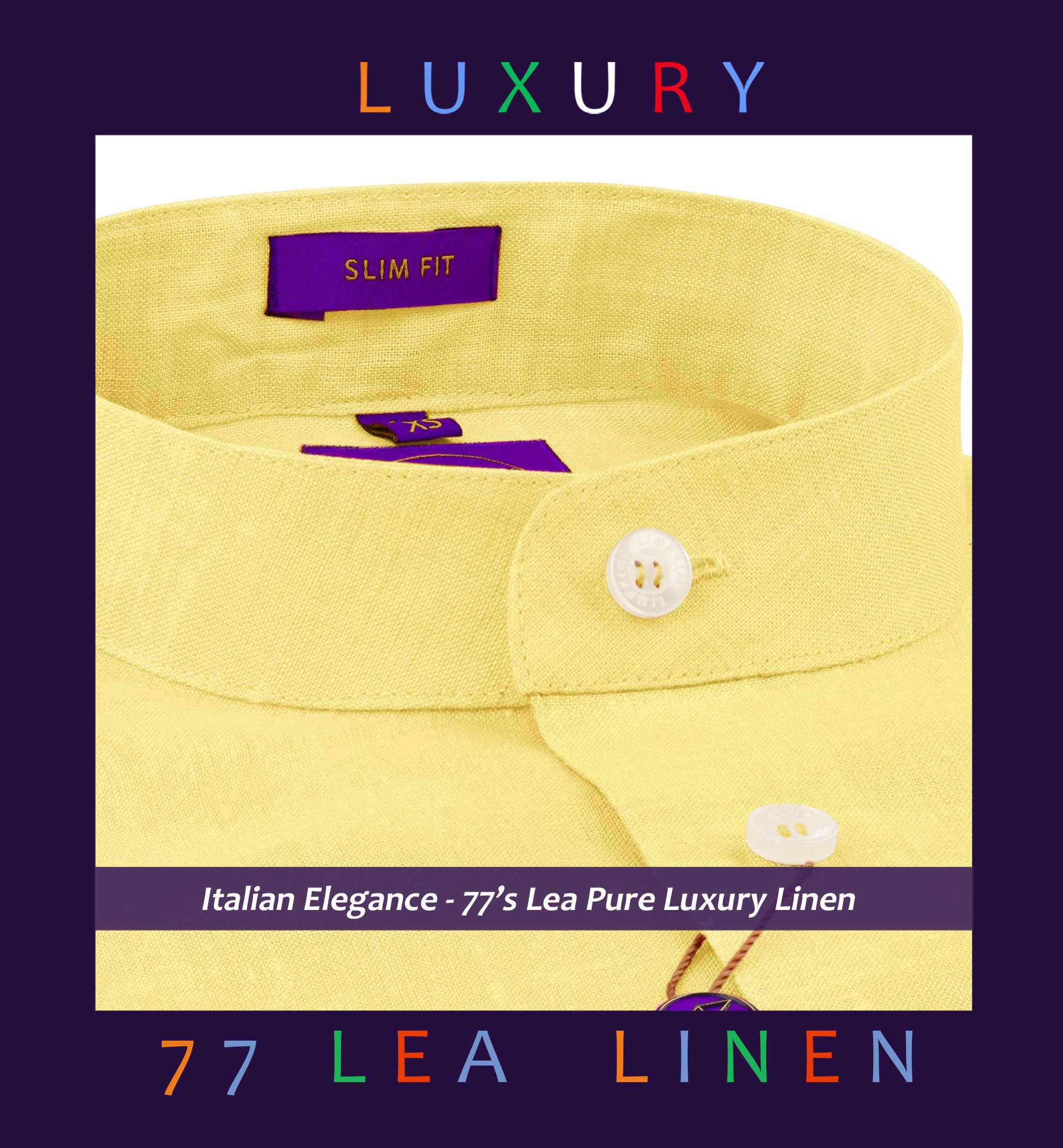 Slim/Regular fit shirt in Daffodil Yellow Solid Linen, Crafted from long staple 77's Lea Linen yarn, Italian Elegance, Plain Weave, Subtle sheen as well as superior hand feel and drape.