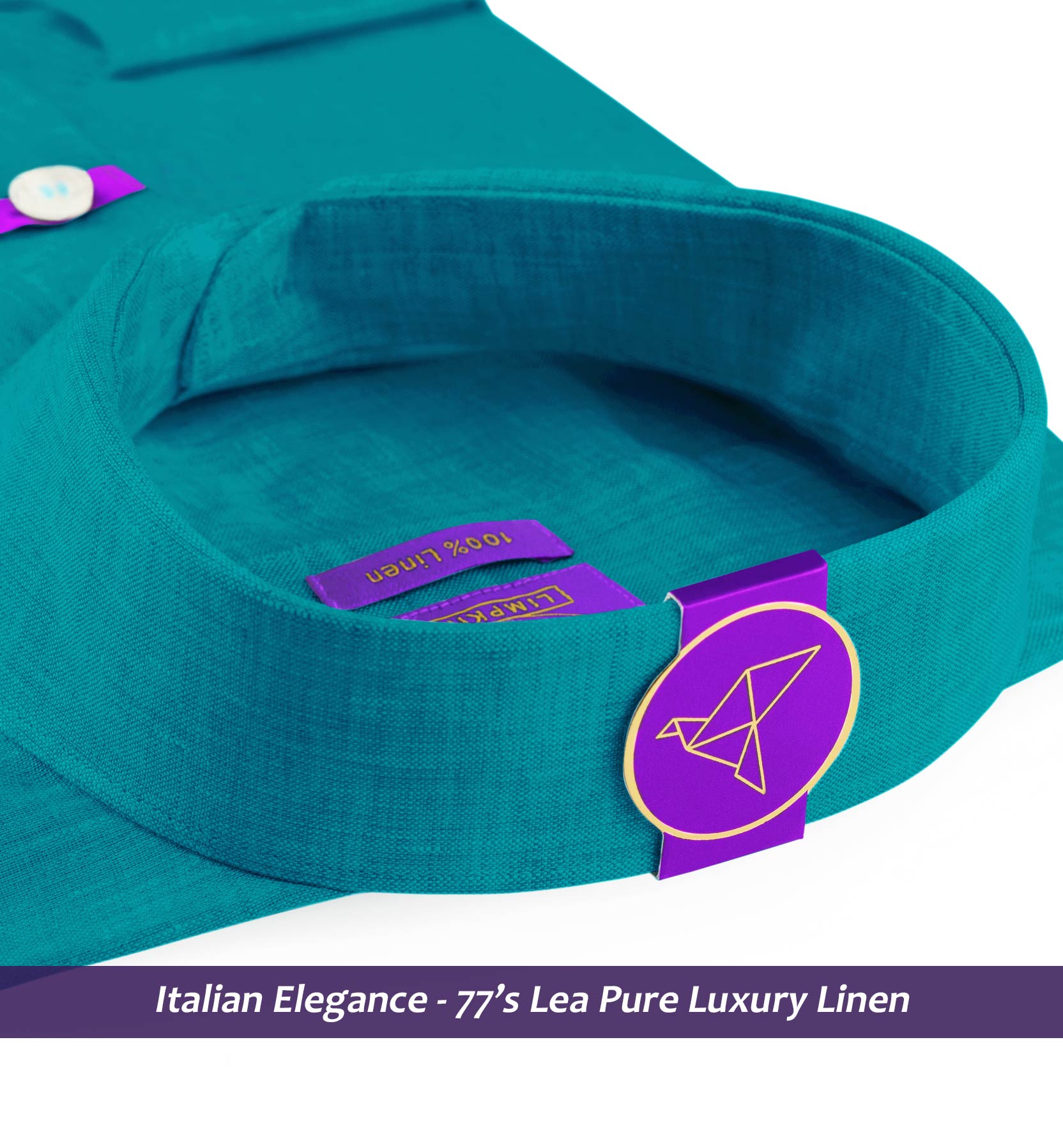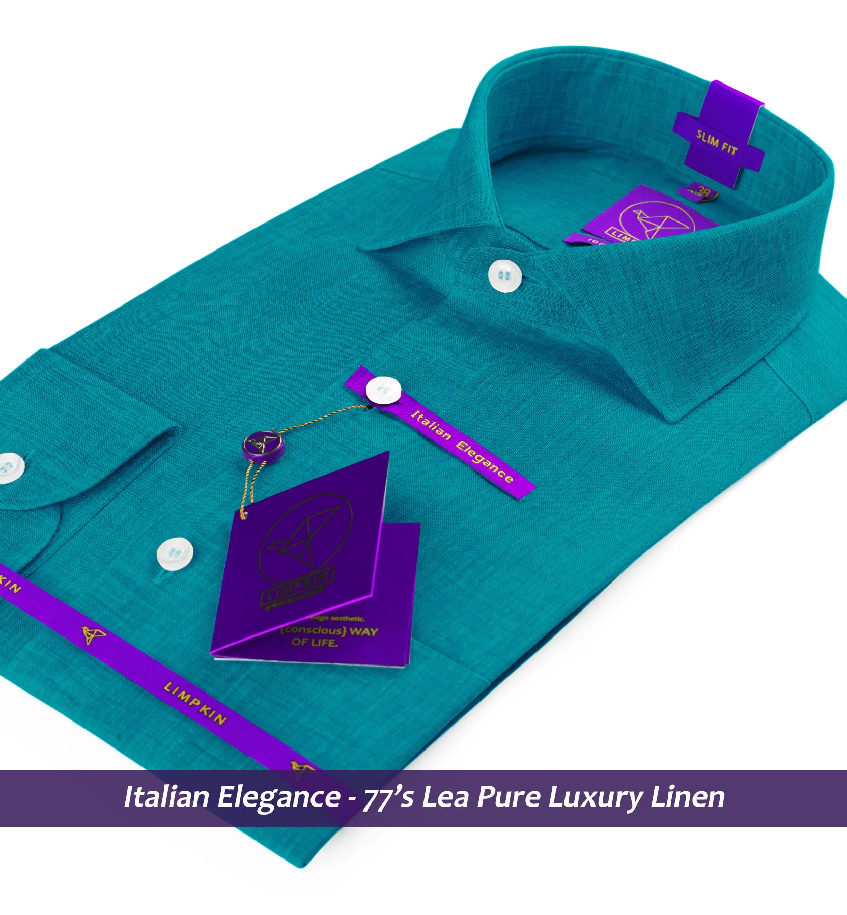 Slim/Regular fit shirt in Turquoise Solid Linen, Crafted from long staple 77's Lea Linen yarn, Italian Elegance, Plain Weave, Subtle sheen as well as superior hand feel and drape.