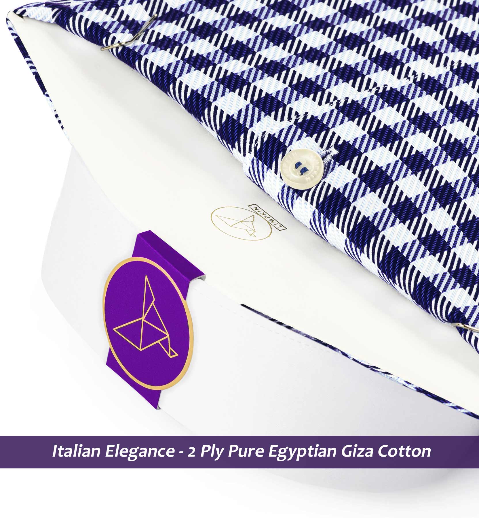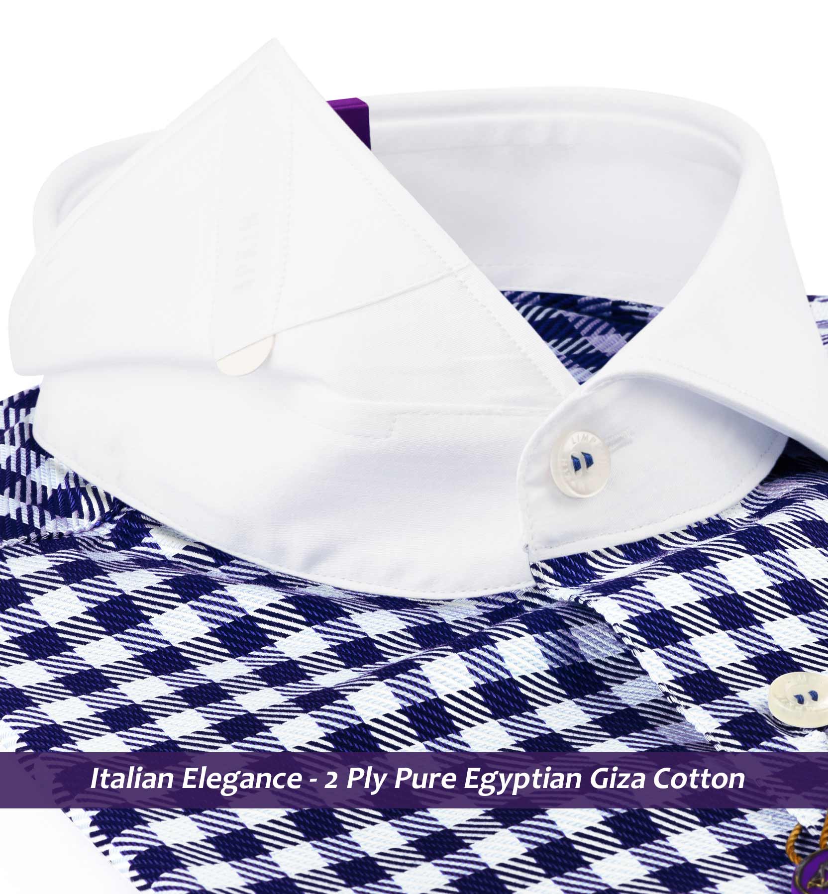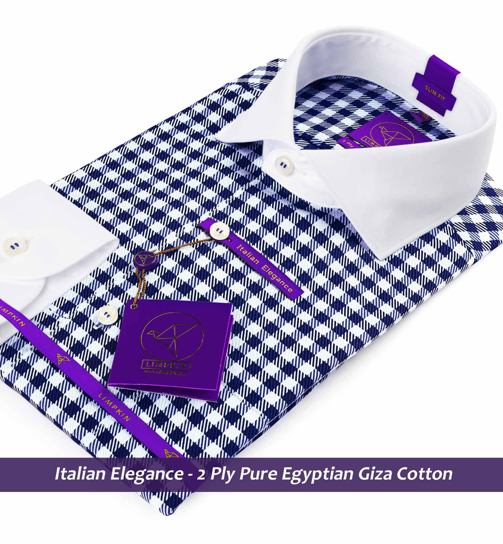 Slim/Regular fit shirt in Navy & Sky Blue Check with White Collar, Crafted from long staple 2 Ply Pure Egyptian Giza Cotton, Italian Elegance, Finished using superior Soft Touch technology, Rich luster and sheen as well as superior hand feel and drape.