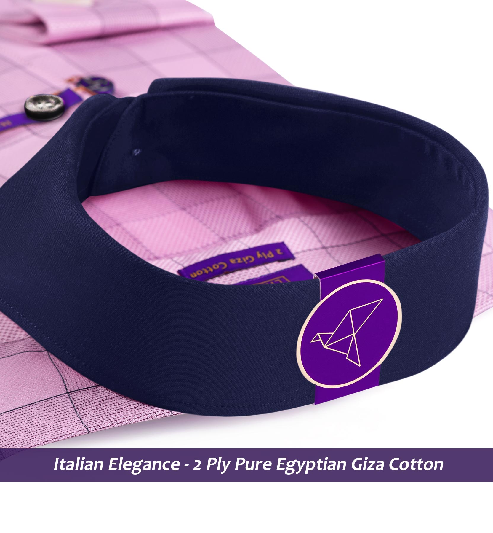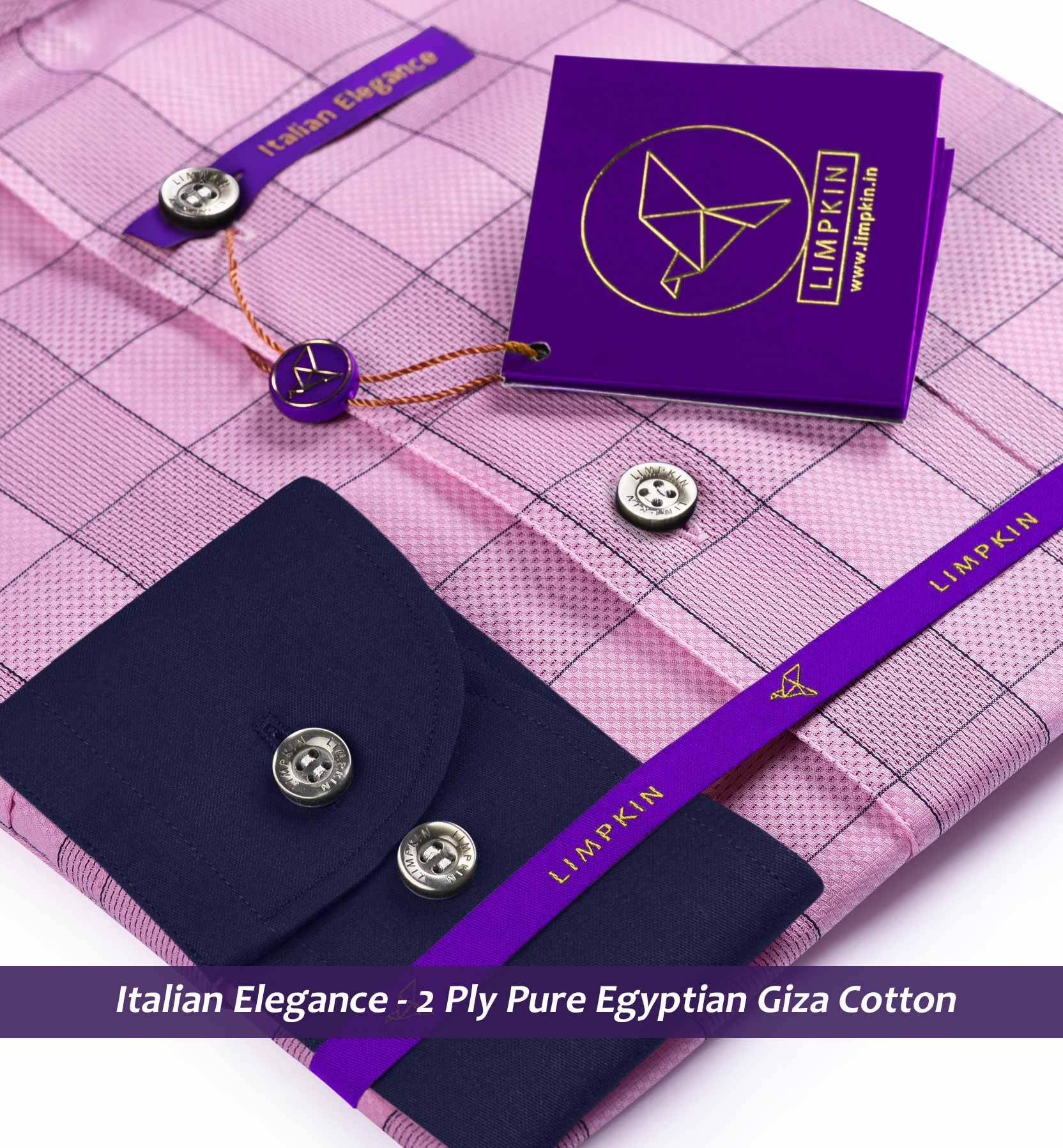 Slim/Regular fit shirt in Flamingo Pink & Grey Check with Navy Collar, Crafted from long staple 2 Ply Pure Egyptian Giza Cotton, Italian Elegance. Finished using superior Soft Touch technology, Rich luster and sheen as well as superior hand feel and drape.