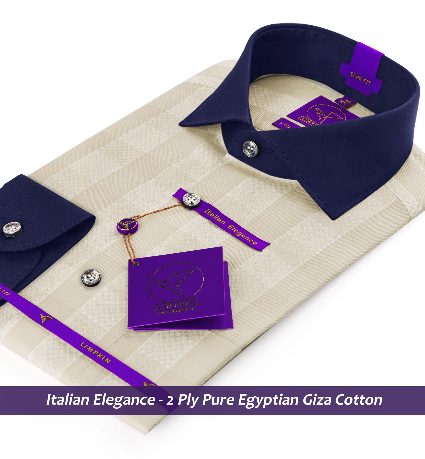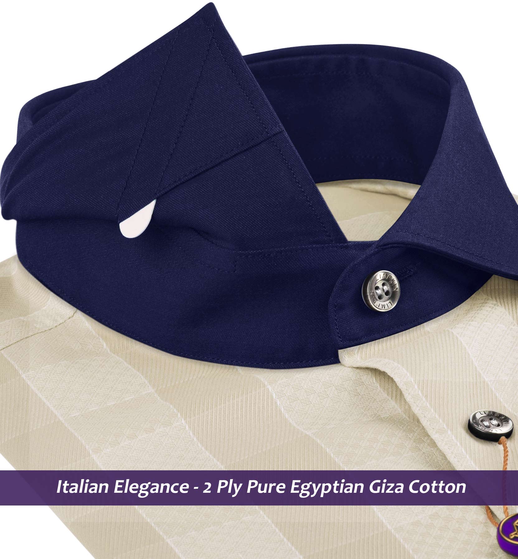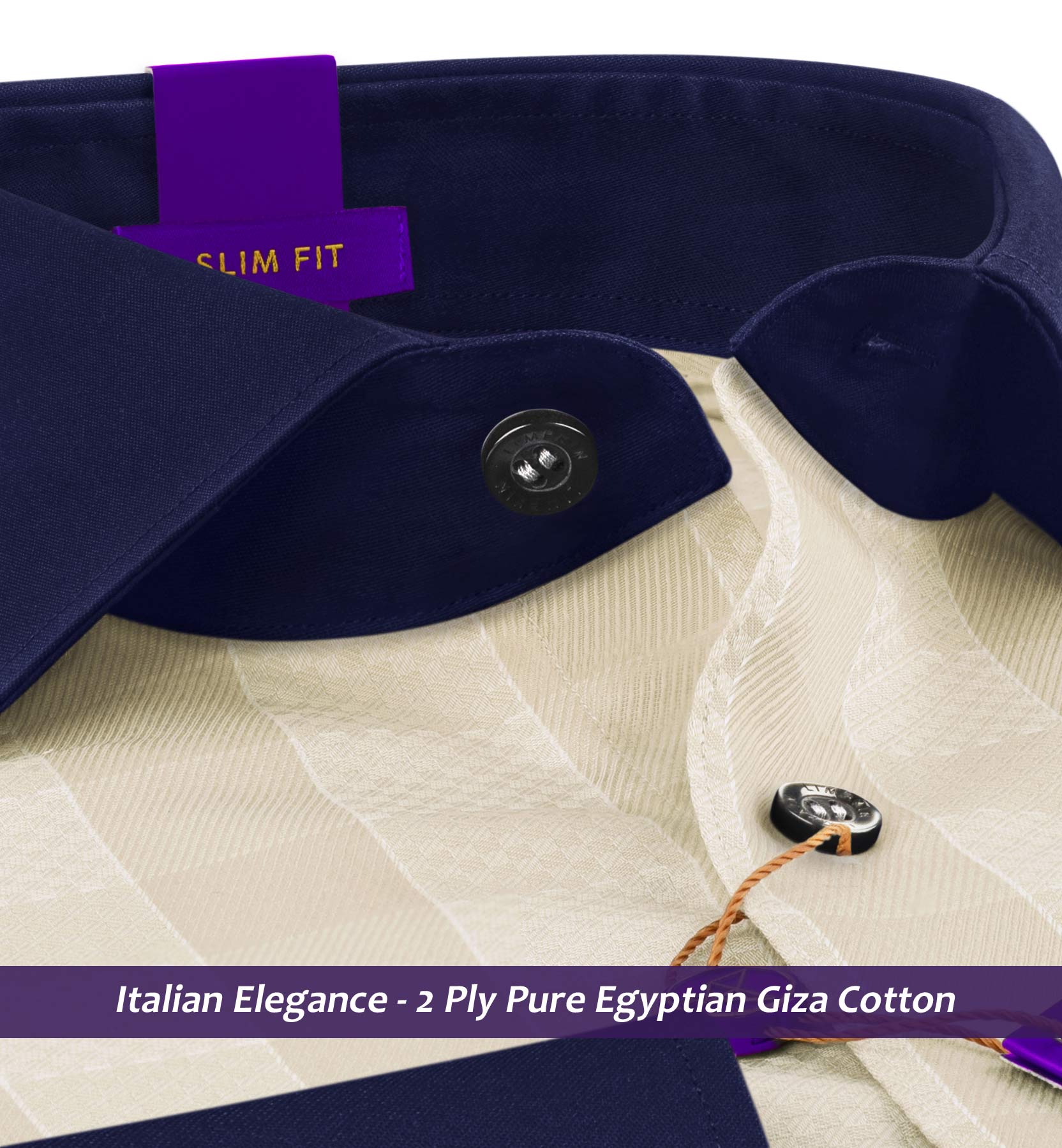 Slim/Regular fit shirt in Cream & Beige Check with Navy Collar, Crafted from long staple 2 Ply Pure Egyptian Giza Cotton, Italian Elegance. Finished using superior Soft Touch technology, Rich luster and sheen as well as superior hand feel and drape.