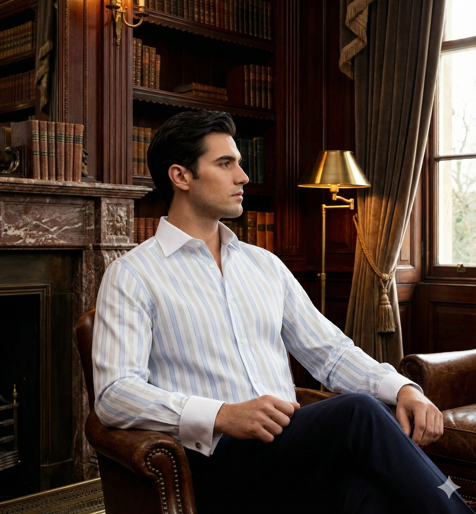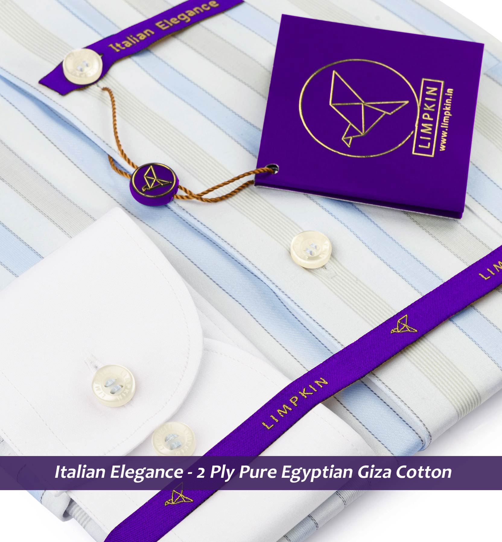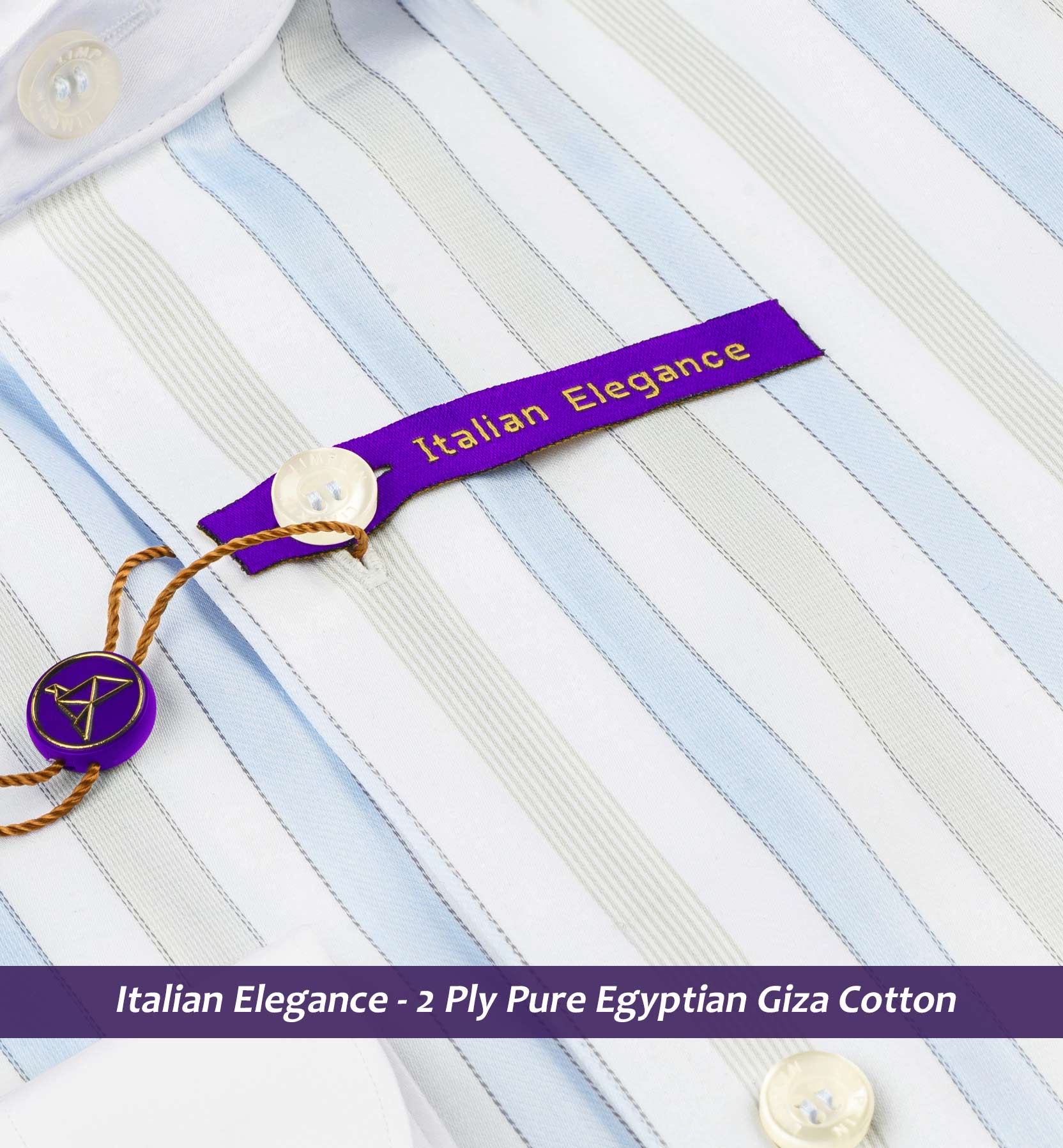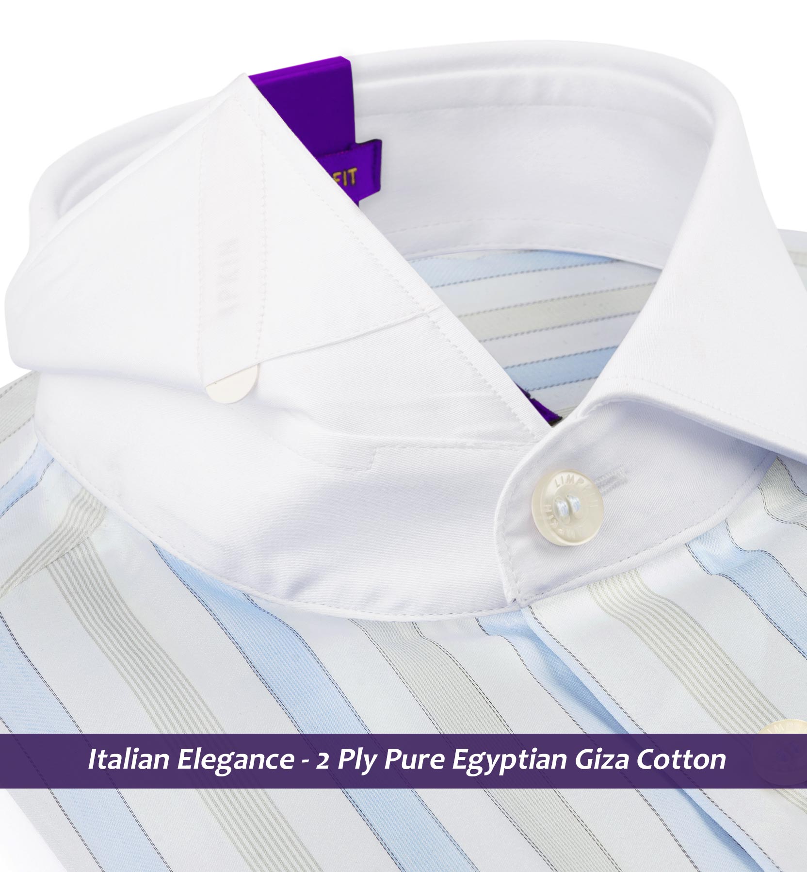Slim/Regular fit shirt in Azure Blue & Beige Stripe with White Collar, Crafted from long staple 2 Ply Pure Egyptian Giza Cotton, Italian Elegance, Finished using superior Soft Touch technology, Rich luster and sheen as well as superior hand feel and drape.