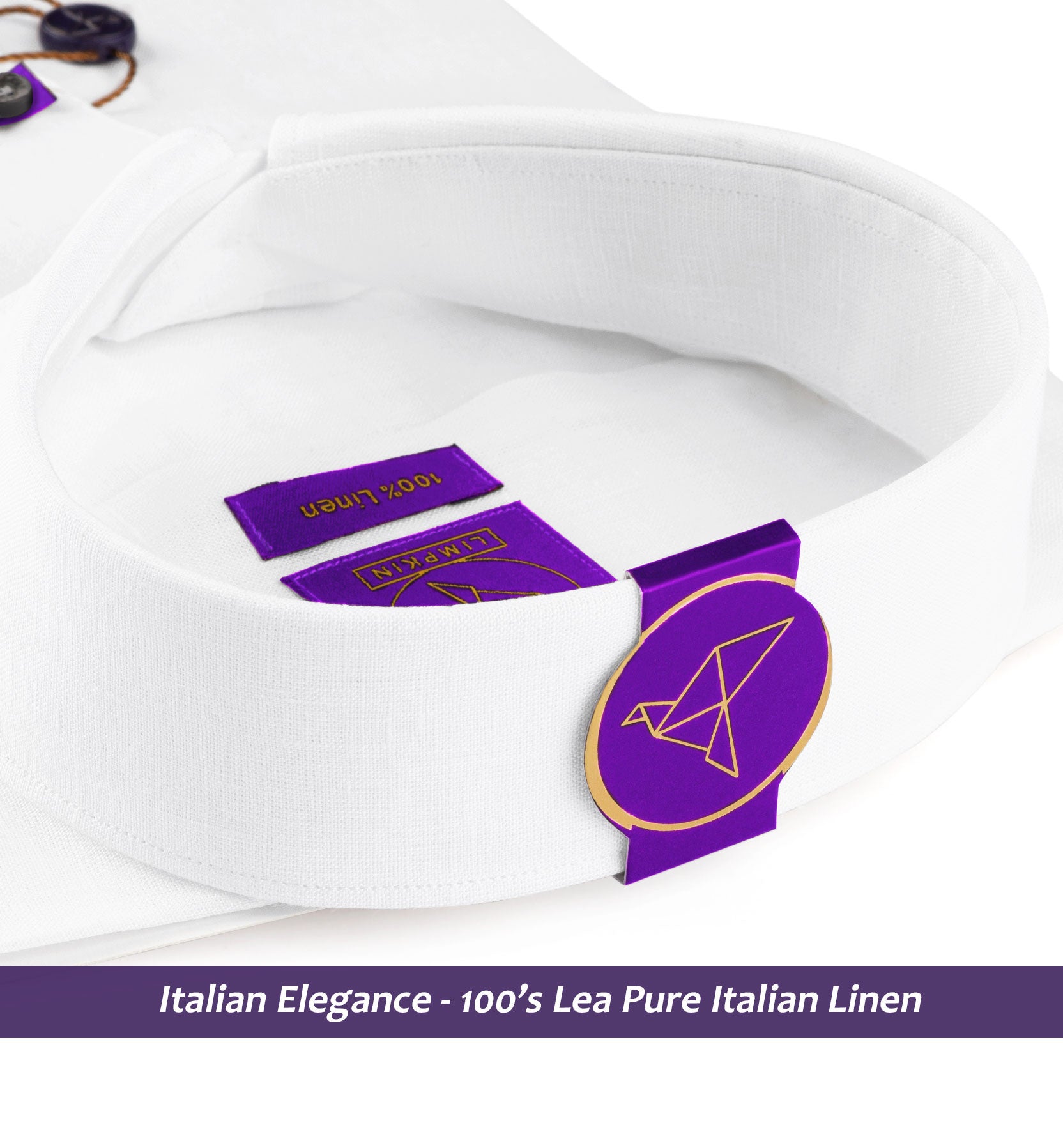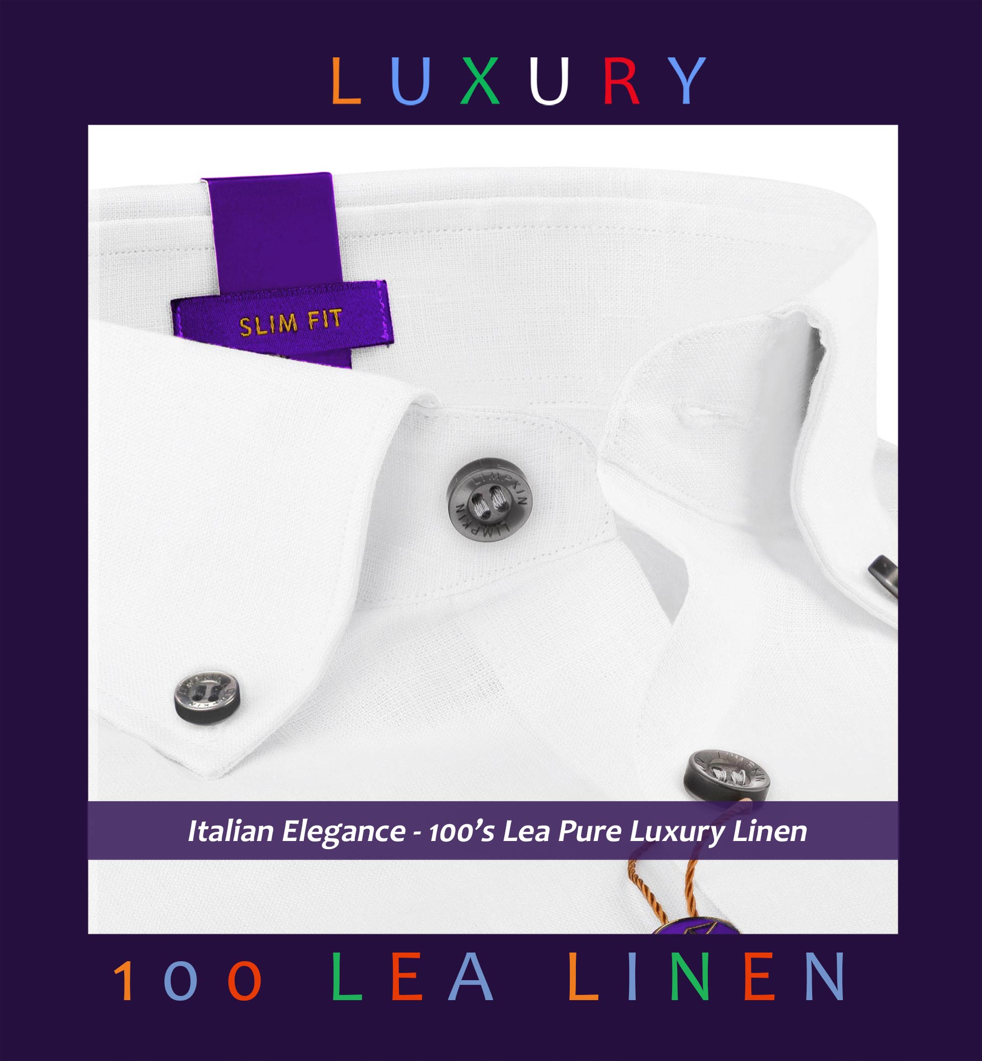 Slim/Regular fit shirt in Pristine Pure White Linen Button Down with Contrast Details, Crafted from long staple 100's Lea Linen yarn, Italian Elegance, Plain Weave, Subtle sheen as well as superior hand feel and drape.