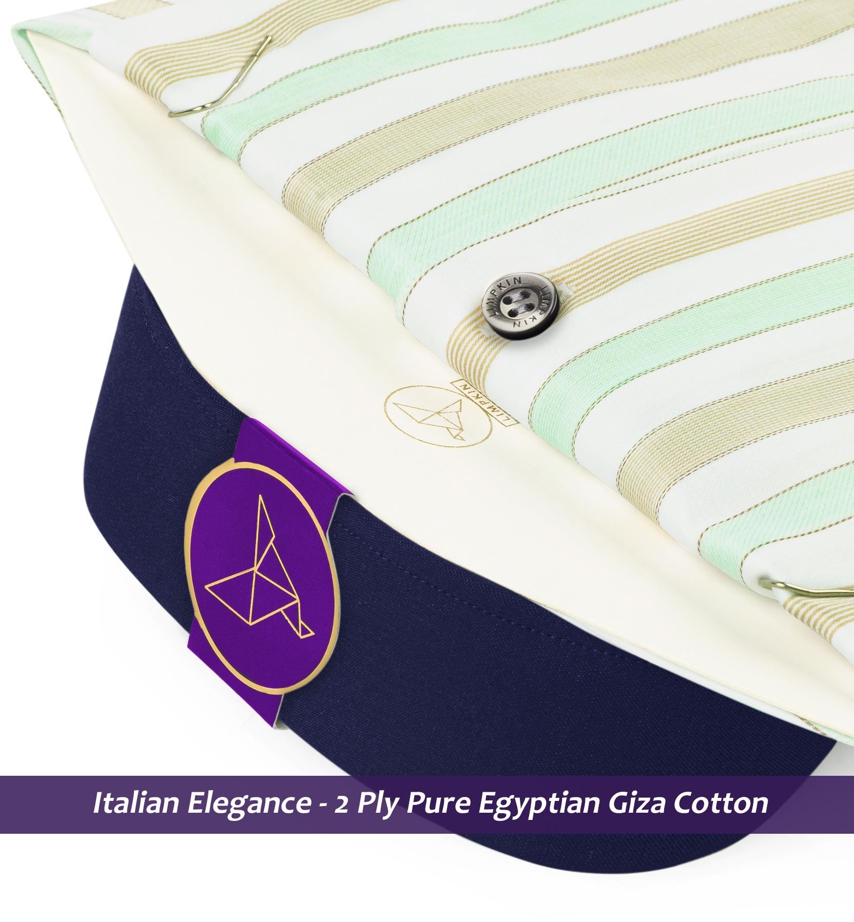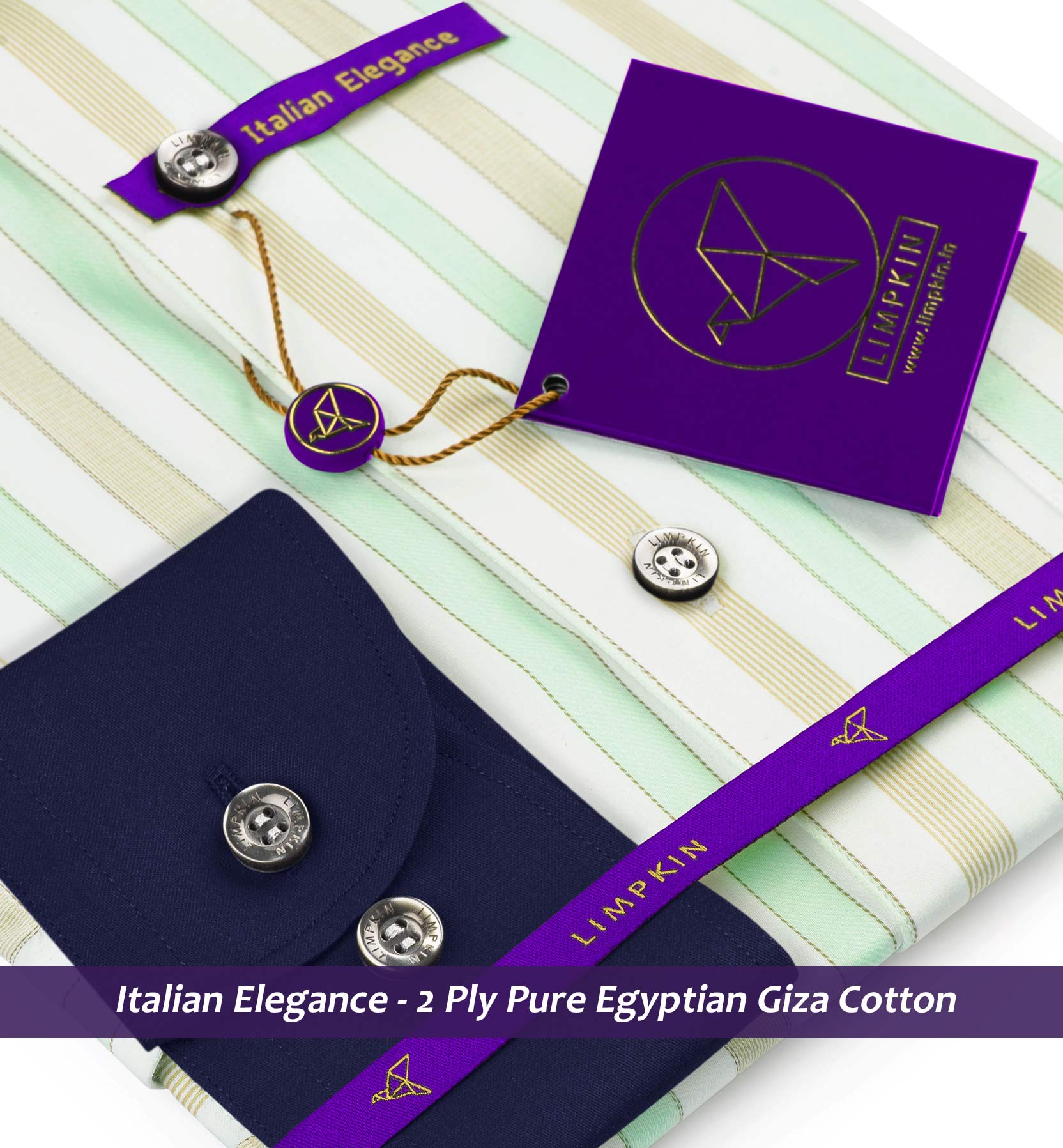 Full Cutaway Collar, French Placket, Full Sleeves/Half Sleeves, Round Cuff with adjustable buttons, Round Bottom Hem, Mock Mop Buttons, Detachable Collar Stays, White Collar & Cuff for that Elegant Look. These shirts are perfect for Special Occasions. All Limpkin Shirts are stitched with an almost invisible 18-21 stitches per inch. German interlinings in the fusing of collars and cuffs ensure a perfect shape and timeless elegance. It comes with Navy single cuff & can be made with Navy French Cuff/Double cuff on demand.