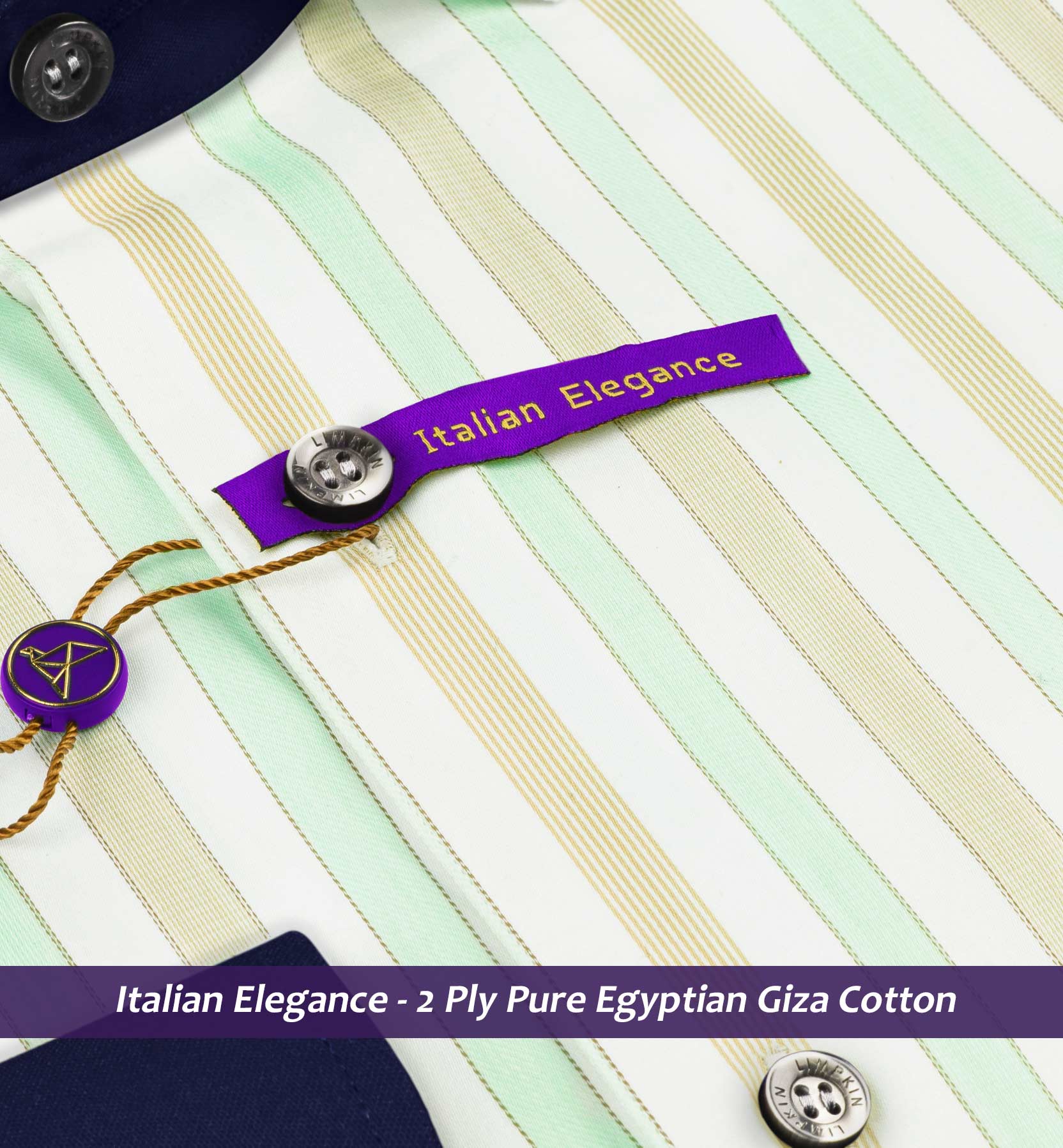 Slim/Regular fit shirt in Mint Green & Beige Stripe with Navy Collar, Crafted from long staple 2 Ply Pure Egyptian Giza Cotton, Italian Elegance, Finished using superior Soft Touch technology, Rich luster and sheen as well as superior hand feel and drape.